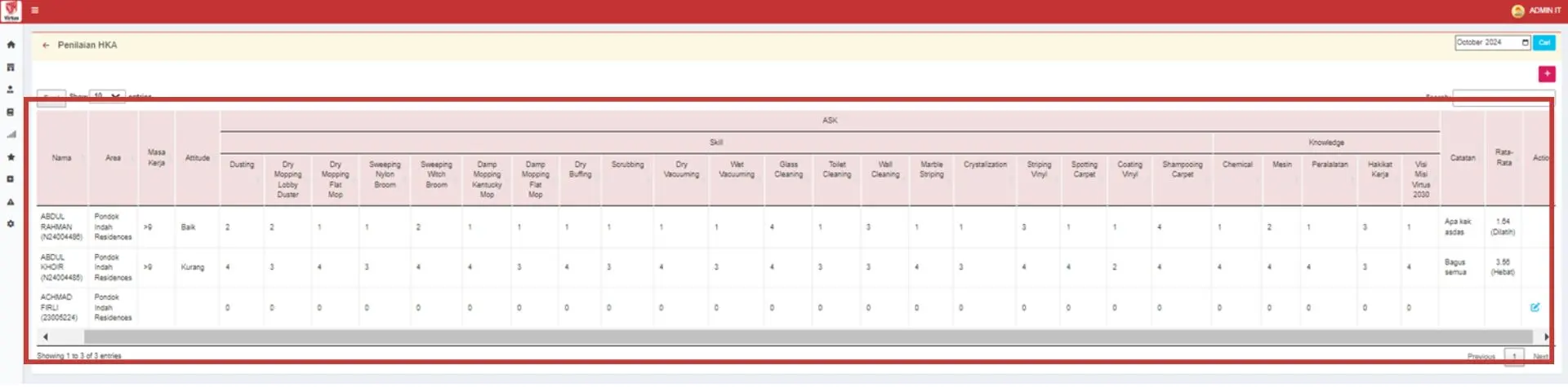- Simpan Hasil: Setelah menyelesaikan pengisian semua kriteria penilaian, pastikan untuk mengklik tombol Save yang terletak di bagian paling bawah. Setelah disimpan, hasil penilaian dan rata-rata dari skill & knowledge user akan ditampilkan secara otomatis.